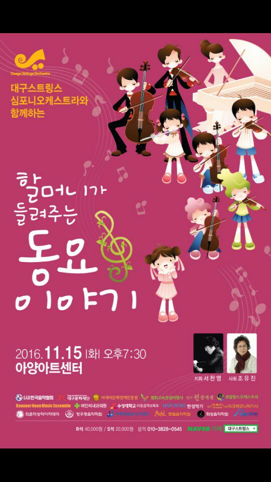 대구 스트링스 심포니 오케스트라와 함께하는 "할머니가 들려주는 동요 이야기" 페이지 정보 작성자 관리자 작성일 16-11-14 17:24 본문 대구 스트링스 심포니 오케스트라와 함께하는 "할머니가 들려주는 동요 이야기" 목록