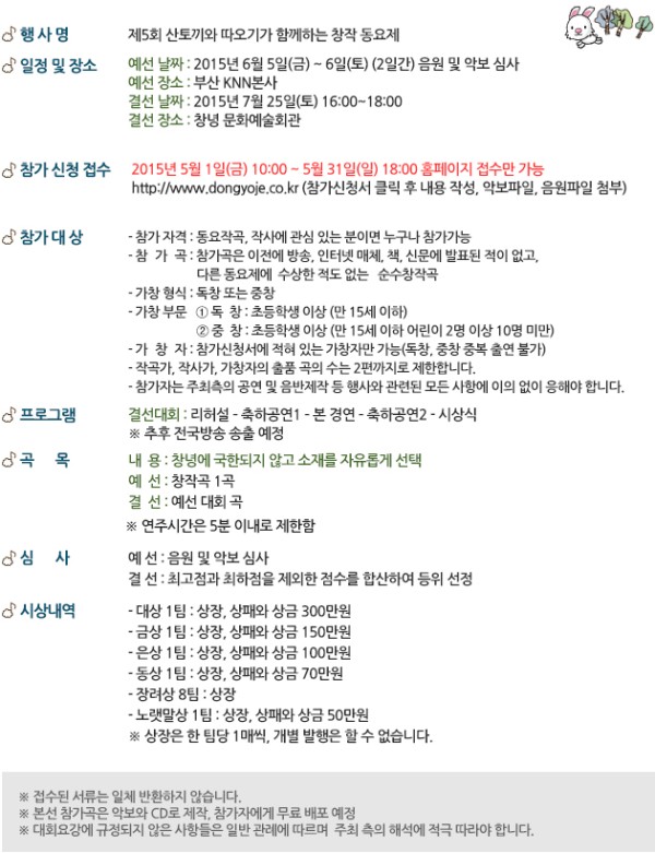 제 5회 산토끼와 따오기가 함께하는 창작동요제 알림 페이지 정보 작성자 이주희 작성일 15-05-18 15:29 본문 주제가 정해져있던 작년과는 달리 올해에는 자유 주제입니다. 많은 관심과 참여 부탁드립니다 수정 삭제 목록