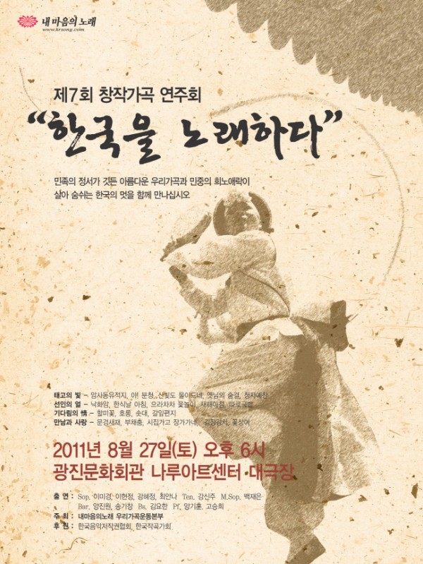 제7회 연주회는 한국인의 삶을 주제로 한 '한국을 노래하다'이며 이번 연주회 18곡의 창작가곡이 노래로 한국을 알리는 새로운 발판이 되도록 준비하고 있습니다.