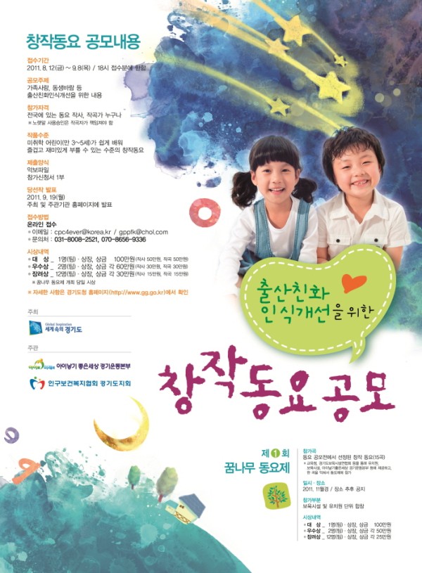 「경기도」와 「아이낳기좋은세상 경기운동본부」는 출산친화인식개선을 위한 동요 공모를 통해 유아와 부모가 자연스럽게 가족․출산에 대한 긍정적인 인식을 갖도록 분위기를 조성하고자 합니다.