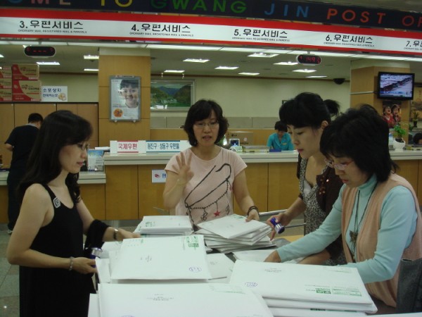 우체국으로 운반하여 요금별납 도장을 찍은 후 접수하는 과정이
