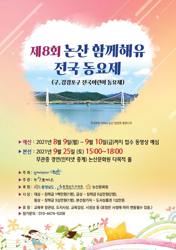 논산 함께해유 전국동요제 참가자 모집 페이지 정보 작성자 서준석 작성일 21-08-23 14:53 본문 강경포구전국어린이동요제가 이름을 바꾸어 논산 함께해유 전국동요제로 다음달에 개최합니다. 지난 2년동안 아프리카 돼지열병과 코로나19로 개최하지 못했는데 이번에 무관중으로 대회를 열려되었습니다. 많은 참여 바랍니다. 수정 삭제 목록