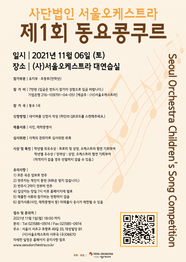 사단법인 서울오케스트라 제1회 동요 콩쿠르 개최 및 접수 안내