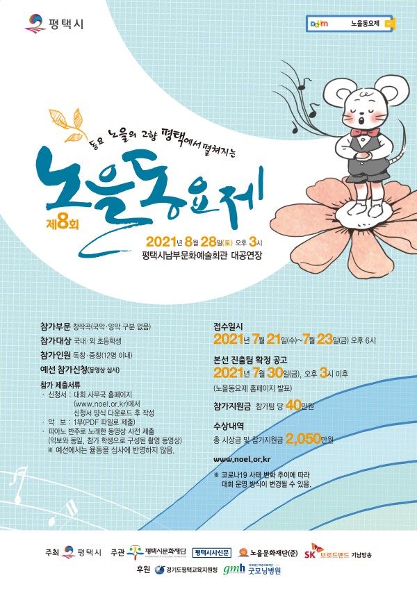 평택시가 주최하고 평택시문화재단, 평택시사신문, 노을문화재단(준), SK브로드밴드 기남방송이 공동으로 주관하며, 경기도평택교육지원청과 백송의료재단 굿모닝병원이 후원하는 ‘제8회 노을동요제’는 창작곡 중심의 전국 최대 규모 동요제다.
