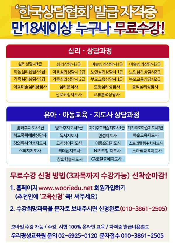 ★무료교육★ 특급자격증!! 취업시 활용가능한 40여개 자격증▶일반인,주부,직장인,대학생 모두가능!! 페이지 정보 작성자 교육팀 작성일 17-05-31 18:17 본문 우리평생교육원 홈페이지 : www.wooriedu.net 우리평생교육원 홈페이지 : www.wooriedu.net 우리평생교육원 홈페이지 : www.wooriedu.net 수정 삭제 목록