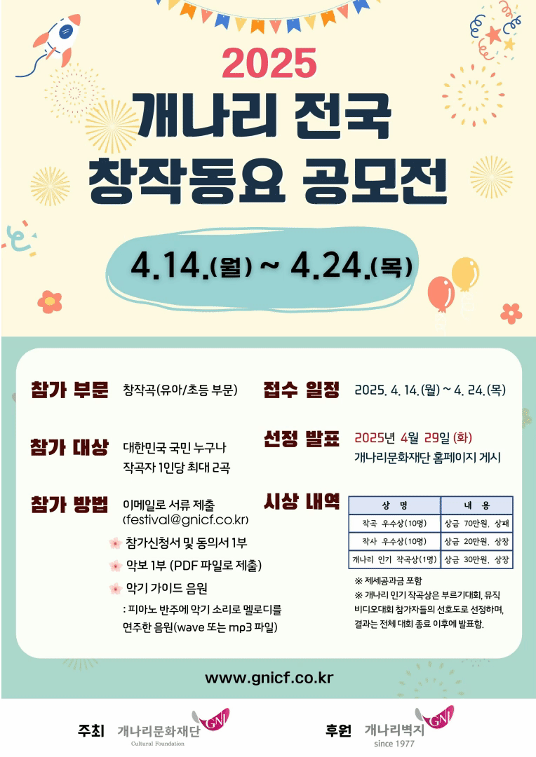 - 2025. 개나리 전국 창작동요 공모전 요강.hwp (0byte) 1회 다운로드 | DATE : 2025-12-01 17:46:51