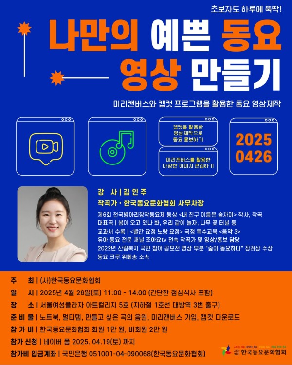 2025 동요문화협회 세미나 < 나만의 예쁜 동요 영상 만들기> 페이지 정보 작성자 관리자 작성일 25-03-30 00:22 본문 참가신청 링크 >>> https://naver.me/502iCkgP 참가비 >> 회원 1만원/ 비회원 2만원 국민은행 (한국동요문화협회) 051001-04-090068 목록
