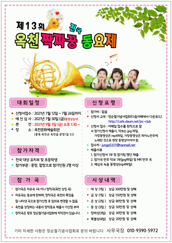 제13회 옥천 짝짜꿍 동요제 페이지 정보 작성자 관리자 작성일 21-07-10 13:17 본문 제13회 옥천 짝짜꿍 동요제 첨부파일 제13회 옥천짝짜꿍전국동요제-개최요강.hwp (0byte) 0회 다운로드 | DATE : 2025-12-01 17:46:51 목록