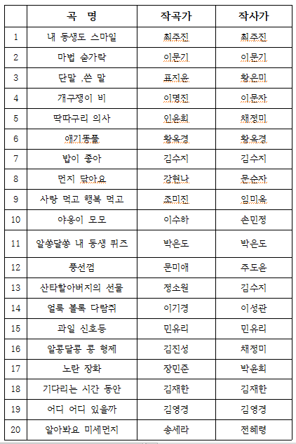 전국에서 유일한 미취학 어린이들을 위한 창작동요 경연인 “제9회 전국 병아리창작동요제” 본선에 진출하신 분들께 축하드리며, 출품하여 주신 모든 분들께 감사드립니다.