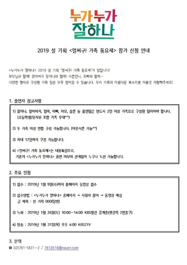 누가누가 잘하나 <얼씨구! 가족동요제> 참가 신청 안내 페이지 정보 작성자 관리자 작성일 18-12-05 21:33 본문 누가누가 잘하나 <얼씨구! 가족동요제> 참가 신청 안내 목록