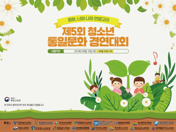 제5회 청소년 통일 문화 경연대회 페이지 정보 작성자 관리자 작성일 18-07-03 22:47 본문 제5회 청소년 통일 문화 경연대회 자세한 내용은 통일문화 경연대회 홈페이지( http://www.uni-contest.kr/ ) 를 참고해 주세요 목록