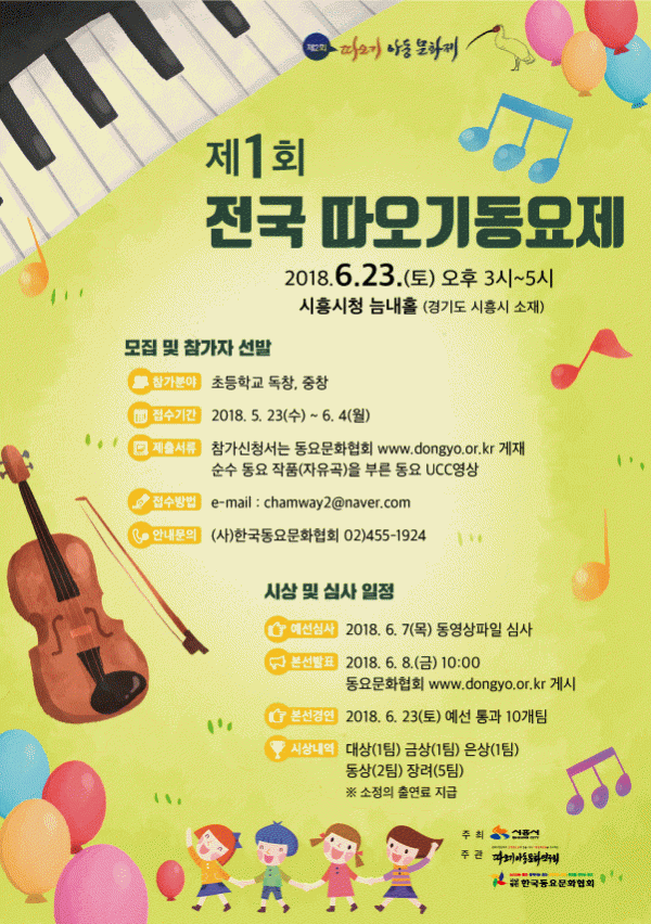시흥시와 (사)한국동요문화협회, 따오기아동문화연구회에서는 전국 초등학생을 대상으로 아래와 같이 제1회 전국 따오기 동요제를 개최합니다.