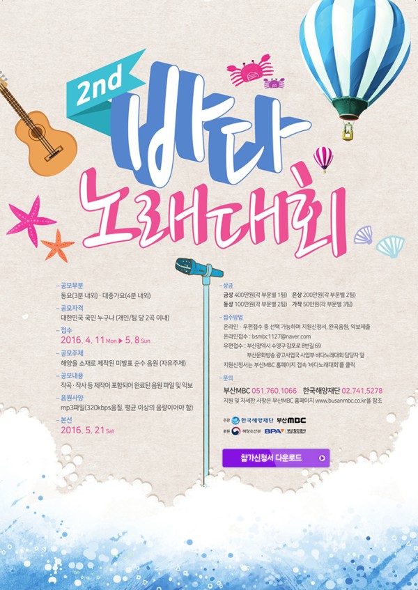 제 2회 바다노래 공모전 (참가신청서 첨부) 페이지 정보 작성자 관리자 작성일 16-04-12 10:15 본문 제 2회 바다노래 공모전 첨부파일 바다노래대회참가요강및신청서.zip (0byte) 0회 다운로드 | DATE : 2025-12-01 17:46:51 목록