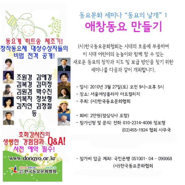 - 참가비 입금 계좌: 국민은행 051001- 04 - 090068 (사)한국동요문화협회